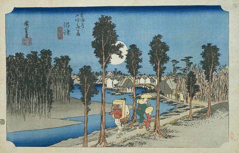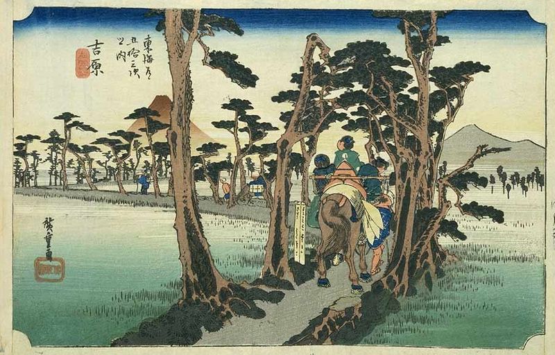 Me voici aujourd'hui à Yoshiwara, 14è station de la route de la mer de l'est. Cette municipalité, qui est rattachée administrativement à la ville proche de Fuji, a subi à deux reprises des tsunamis dévastateurs : d'un côté, elle a le Mont Fuji (ci-dessous), plus majestueux que jamais, et de l'autre, l'océan Pacifique. Après le tsunami de 1639, on reconstruisit la petite cité plus à l'intérieur des terres, dans ce qui est désormais l'arrondissement Yadahara de la ville de Fuji. En 1680, Yoshiwara sera à nouveau dévastée par un terrible tsunami et l'on déplaça une nouvelle fois la commune qui reste, encore aujourd'hui, au niveau de la mer. On pouvait apercevoir, durant la période Edo, une longue colonnade de pins qui longeait la route Tokaïdo à Yoshiwara, comme l'indique l'estampe d'Ando Hiroshige (...)